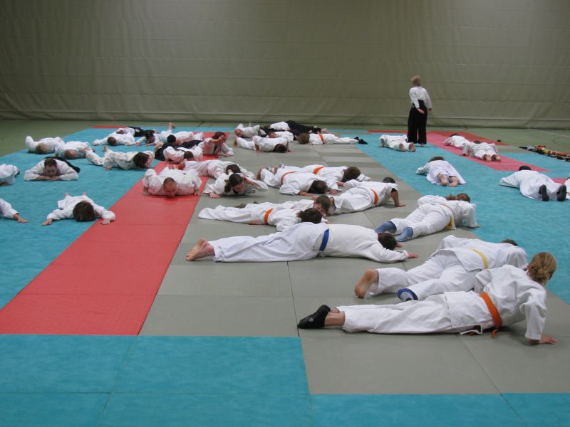 der Prüfung zum 2. Kyu, also der Prüfung zum blauen Gürtel. Zu Beginn wie immer Fallschule, dann noch einmal